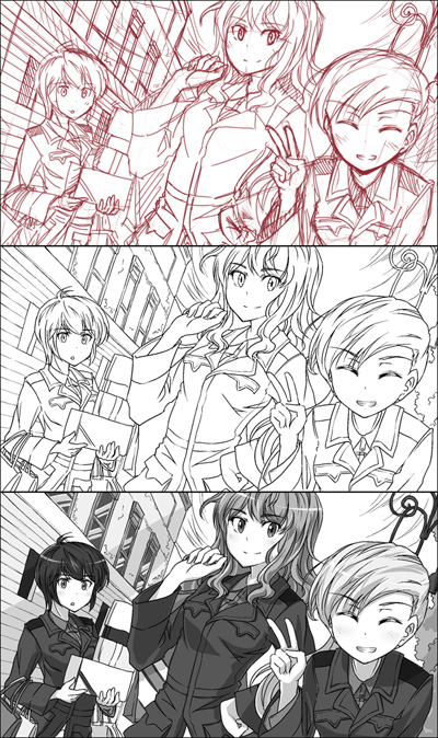 特に「こういったシーンが描きたい!」という特別な何かがある訳ではなく、ただただ自分が可愛いと思う赤ズボン隊3人の姿を描こうと考えながら進めていまして、自分でも最終的にどんなものができるのか、全然見当もつきません。
